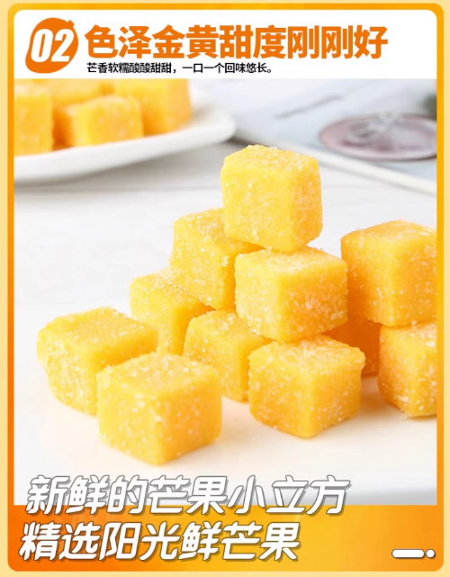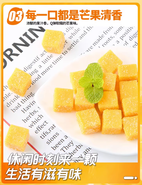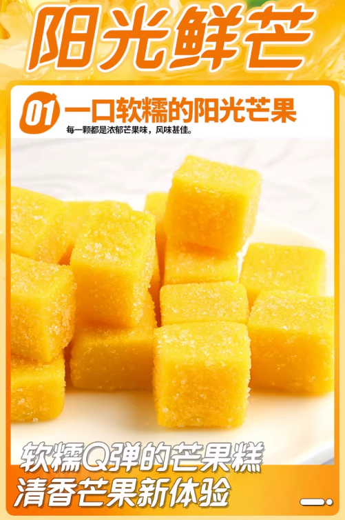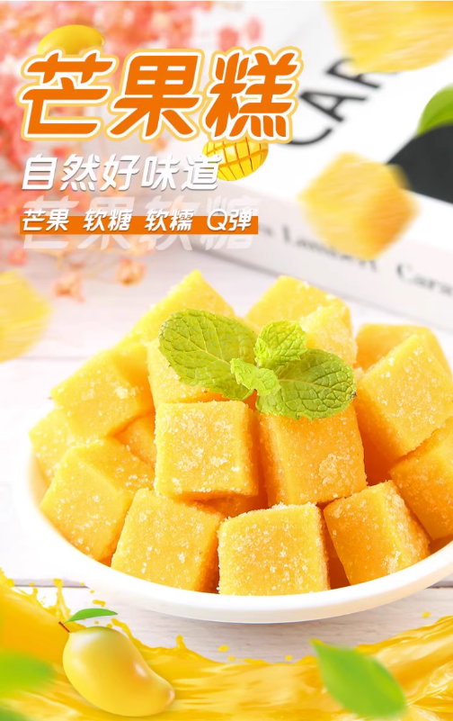 果糕呈诱人金黄色,质地细腻,入口软糯有嚼劲。酸甜滋味完美平衡,芒果香在舌尖肆意蔓延,每一口都是满满的热带风情,让您随时随地享受芒果的独特魅力,是休闲时光、解馋必备的美味零食。